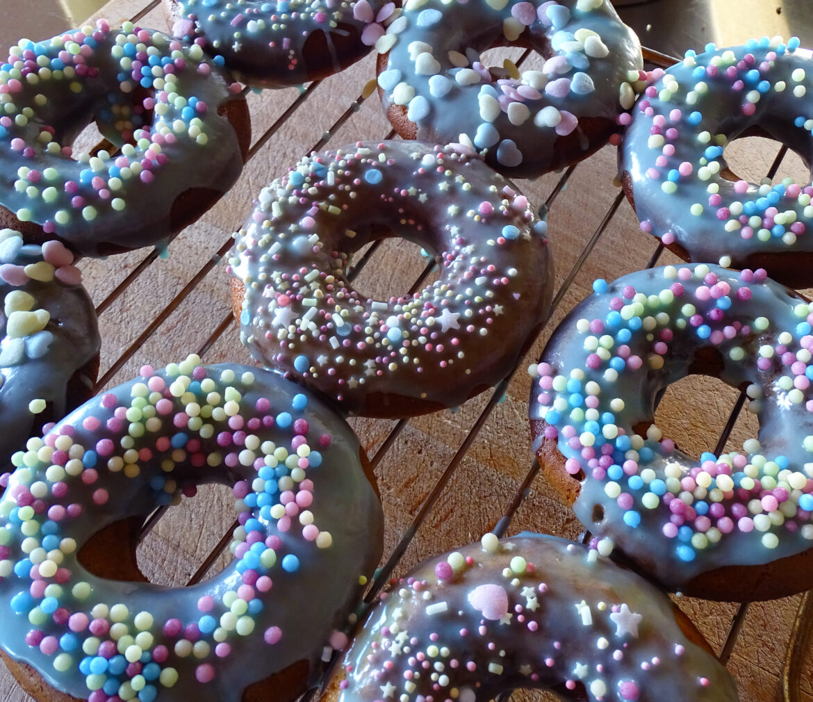 Det som de fleste børn finder underholdende ved at lave hjemmelavede donuts er selvfølgelig pynten. Her kan man virkelig gå all-in eller man kan køre en simpel klassisk pynt med glasur og krymme. Jeg elsker den her øko sprinkles som er farvet med naturlige farvestoffer fra f.eks. gulerod, spirulina, blåbær mm.
